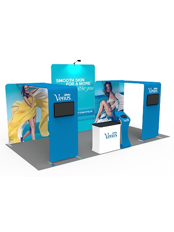 Estos Stands Portátiles de Tela son ideales para espacios de 3×6 m, y son versátiles para otros espacios ya que se componen de dos o tres módulos que se pueden configurar en I, L o U para espacios más reducidos o esquinas.